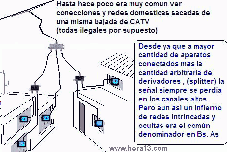 Y ahora pasamos a explicar porque el invento no funciono y si lo hizo de algún modo fue precario y con demasiada perdida de señal ... Por supuesto que aqui en las imágenes exageramos un poco la cosa , o tal vez no , vimos demasiadas redes domesticas donde podías deducir de donde venia el cable original , pero era casi imposible saber a la cantidad de lados que lo redirigían los usuarios . Pero supongamos que tienes solo tres televisores que en determinado momento funcionaban " aparentemente bien" con la señal de cable , y le agregamos que tenias un solo derivador de tres salidas (splitter) ......... Antes de seguir deseo hacer un paréntesis aclarando algo que seguro nos costara muchos correos de lectores con sus criticas .. Es verdad que había y hay muchas clases de derivadores algunos con menos perdidas que otros según las marca , modelos y costos y es verdad también que muchos usuarios compraban amplificadores que se vendían en comercios de electrónica con el fin de amplificar las señales de entrada para superar las perdidas de tantos aparatos conectados Y vaya que se vendían.... Pero estamos hablando en este caso de un 70 % de usuarios que No usaban o No compraban estos amplificadores y simplemente salían corriendo a la ferretería de su barrio a comprar splitter ( derivadores) como si fuesen caramelos , todo era cuestión de saber cuantos televisores tenia el vecino o la hermana etc mas etc y colocarlos para dar señal de cable a terceros . Así se armaron en forma precaria cientos y cientos de redes en cada barrio . Bueno las compañías de cable cambiaron los sistemas y todo se murió , no daremos detalles puntuales del porque muchísimos usuarios dejaron de contratar el servicio ( creo que todos sabemos el porque $$$ ) y las redes domesticas quedaron ahí en cada casa abandonadas y sin señal . Luego a alguien se le ocurrió la gran idea, si ya tengo toda la instalación hecha para tres o cuatro TV , coloco una antena y listo ... Aclarado esto seguimos ... Imaginemos que tu tenias o tienes la línea de CATV muy bien cableado en toda tu casa y como te gusta el orden y el buen gusto llevaste ese cable bordeando ventanas , puertas etc , bueno ese orden y buen gusto también hoy te juega en contra , porque sumaste metros y metros con la perdida de señal correspondiente , solo para que tengas una idea muy simple y domestica te daré algunos detalles a saber A continuación los cables mas utilizados en conexiones con sus perdidas de señal " por metro " RG 58 cable muy común, utilizado 1 dB de perdida por metro - cable HDF200 es de 0.5 dB de perdida por metro - cable RG-316 es de 1.5 dB de perdida por metro - HDF-400 es de 0.2 dB de perdida por metro - RG 213 otro muy común tiene 0.6 dB de perdida por metro y etc mas etc .. Claro cuando tenias señal por cable esto no se notaba tanto ( simplificando un poco el concepto ) pero ahora colocaste una antena y seguro es de poca ganancia porque en estos casos casi siempre vamos corriendo a cualquier ferretería o casa de electricidad y compramos la mas barata o la que nos venden como buena claro.. Bueno esa pobre antena ahora se enfrenta a metros y metros de cableado con las perdidas que antes te mencionamos y no quieras imaginar que pasaría si a esto le sumamos que tenias colocado varios derivadores que llevaban mas cableado a la casa del vecino o familiar .... Un verdadero desastre porque nadie vería nada y ahora por fin " entiendes el porque " Soluciones ? Seguro que las soluciones que te brindaremos en este caso no serán de tu agrado pero , ya nos vienes conociendo desde el primer capitulo y sabes que no alimentamos fantasías , por lo tanto desde ya olvídate de ser " generoso" y seguir brindando señal a familiares vecinos etc .porque nadie vera nada y si algo de señal llega será muy pobre inestable y los problemas seguirán en aumento . Segundo , cómprate o ármate una buena antena que garantice una excelente ganancia por lo menos en los canales que deseas recibir y olvídate de las que se venden en tu barrio de " oferta" ya hablamos de esto en otros capítulos . Tercero , con una buena antena y un derivador " splitter" de muy baja perdida los hay y muy buenos (no podemos dar marcas ) y tal vez acortando un poco la cantidad de metros de coaxial que llega a tus aparatos , puedas alimentar sin mayores inconvenientes y con señal estable hasta dos televisores , pero no mas que eso .... Cuarto , y en cuanto a " los demás" simplemente les dices que hagan exactamente lo que terminas de realizar tu o sea " montar una buena antena , ganar buena altura , comprar un buen spliter para dos TV y a otra cosa . Y si alguien por ahi te sugiere comprar amplificadores , ( booster) y luego derivadores electrónicos para tantas bocas y etc mas etc . piensa si para cuatro o seis canales de aire vale la pena semejante gasto , porque ya hablamos que ni siquiera canales de UHF quedan en el aire salvo dos o tres religiosos y algún que otro zonal y nada mas y después de semejante gasto comprando cajitas magicas aun no sabes si con esto solucionas el problema , porque como vimos en otros capítulos aqui la magia No existe y si tu antena es pobretona y ademas tienes una red de cableado muy importante en cantidad de metros , recuerda que hay una ley básica muy vigente que reza : Amplificar nada da por resultado nada " No lo olvides . |