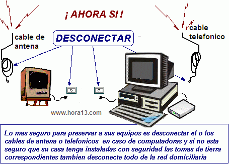 Para ir finalizando , siempre ante la duda desconecte todo volvemos a mencionar , cables de bajada antenas , cables coaxiales moden , líneas de teléfono que vayan a su computadora etc. También se venden en comercios especializados , algunos conectores que van en la antena y vienen con sus tomas de tierra , para neutralizar las fuertes descargas , pero ojo ( no hacen milagros ) Es solo una prevención mas a tomar en cuenta . |