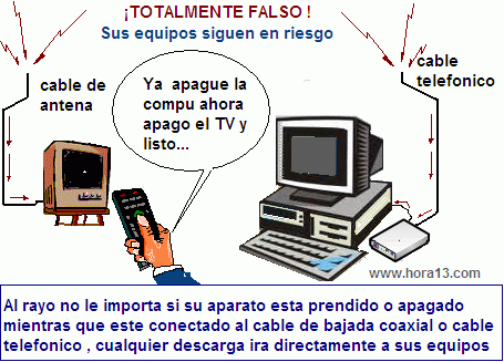 Mire es como todo , uno no toma conciencia hasta que le pasa .. Cuantas veces escuchamos a alguien muy disgustado comentar : Cayo un rayo cerca de mi casa en un pino u árbol y me quemo el televisor y también el modem de mi computadora . En realidad todavía este vecino tuvo bastante suerte porque lo que recibió es una parte residual de un rayo , porque de caerle un rayo en su totalidad estaríamos hablando de ... 30.000 a 300.000 amperes de potencia , todo durante millonésimas de segundo, con unos15 millones de voltios y disipando un calor aproximado de 8000 grados , que le parece ? Le puedo asegurar que no le quedaría nada , ni cable ni aparato y le sumamos a este desastre un riesgo muy grande de incendio . Pero aun siendo victimas por cercanías de la caída de un rayo aunque hablemos de bifurcaciones o tensiones residuales con semejante potencial , para nuestros equipos siempre será un riesgo mortal . Mitos y mentiras siempre circularon de boca en boca 1 . Yo apago mi TV y compu y listo estoy protegido ... 2 - Yo desenchufo los aparatos del toma corriente y listo .... Para empezar dos mitos que son mentiras y sabe porque ? Tal cual lo vemos en la figura a su derecha y esto obedece a algo muy simple , recuerde que un rayo y todo su potencial ( viene de arriba ) o sea que de alguna forma tocara su antena o red telefónica en caso de computadora y si estos conductores aun se encuentran conectados a sus equipos , de nada servirá si están apagados o no , porque entrara igual dañando todo a su paso . Mejor y mas seguro es desconectar tanto el cable de bajada de su TV o computadora en casos donde las tormentas son muy severas . Este fenómeno se da mucho en verano ( hay sitios muy buenos que hablan al detalle de estos eventos climáticos ) Mitos y mentiras 1 - Yo me hice una buena toma de maza colocando un cable a una canilla ... 2 - Yo coloque un cable atornillado al chasis de mi equipo y lo mande a tierra con un clavo . Dos mitos mas que son mentiras , nada absolutamente nada suplanta a una toma de tierra que no este correctamente instalada y con las medidas de seguridad vigente , hay formulas y trabajos "específicos" para construir o instalar , tomas de tierra , pararrayos etc . Es mas , un defecto muy común aun hoy sobre todo en Argentina es ver que muchos aparatos que vienen con sus tomas de tres patas ( incluye toma de tierra) el usuario coloca un adaptador a dos patas dejando libre la tercera , esto obedece a que sus tomas corrientes aun no fueron actualizados , por lo tanto sus equipos no estarán protegidos y también usted no estará protegido por una posible falla de algún aparato , donde puede recibir una fuerte descarga eléctrica causándole inclusiva la muerte , esto nada tiene que ver con los rayos pero es bueno que lo sepa , los aparatos que causan mas accidentes fatales son heladeras , lavarropas , planchas , etc en su gran mayoría no tenían las tomas de tierra de seguridad . |