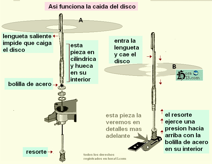 El automático parece que funciona pero no cae el disco Solo para que tengan una idea del tema que vamos a desarrollar vayan mirando la figura abajo... Vamos a este tema la caída del disco y sus posibles problemas Aquí vemos con mayor frecuencia que los posibles deterioros se deben al paso del tiempo , muchos de estos aparatos son encontrados o rescatados con varios años de estar sin uso y sus piezas pierden movilidad y se endurecen , caso frecuente la lengüeta que sale del eje central que retiene el disco , esta no entra con facilidad y es una de las causas que no caiga el vinilo , para el caso se puede probar ejerciendo presión con el dedo hacia adentro para ver si vuelve o no y si no resulta solo queda limpiar la pieza ,que tendrá que desarmar con cuidado ( ver figura arriba ) Casi el mismo problema esta en el resorte abajo del eje central y la diminuta bolilla de acero , como este eje es cilíndrico ( hueco adentro) con el tiempo puede que se solidifique todo en una masa compacta de oxido y aqui no nos que otra alternativa que armarnos de mucha paciencia , tratar de desarmar todo con cuidado , sumergir las piezas en un solvente bueno dejarlas unas horas y tratar de volver a armar esta parte del mecanismo , cuidado que muchos cometen el error de no tener cuidado al desarmar y pierden la bolilla de acero y si cae al piso es casi imposible dar con ella , amen de que no la conseguirás fácilmente . A ver como esto esta dedicado a principiantes también , diremos la clave del éxito esta en algo llamado .. " paciencia " y no inventen cosas sobre todo volvemos al tema rociar al mecanismo del aparato con porquerías .
