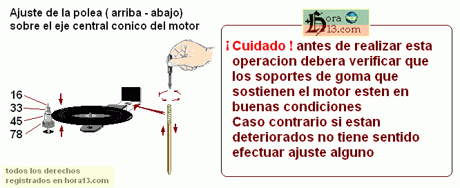 Aqui hay que se cautelosos , antes de retocar el tornillo de ajuste de altura de la polea de goma sobre el eje central del motor , revisar si o si , que las patas de goma que sostienen el motor estén bien es toda su estructura , porque si el motor esta inclinado o caído hacia abajo , no tiene sentido regular nada , es mas la experiencia nos demostró que casi nunca se regula nada , siempre el problema esta en la base del motor , un ejemplo grafico lo tienen abajo