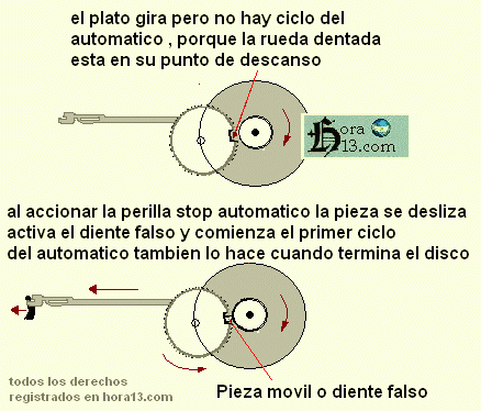 Otro problema que causa dolores de cabeza los técnicos mas experimentados Cuando accionamos la perilla de stop a automático este no responde , no cae el disco y tampoco corta cuando termina el vinilo En realidad se debe a una pieza en apariencia muy simple , pero cumple varias funciones y se suele deteriorar con facilidad , esto sin contar que la misma muchas veces se encuentra endurecida por el tiempo de estar sin uso o por la cantidad de pseudos lubricantes que le colocaron al pobre automático ( vea la figura abajo) Por si quedan dudas , abajo un dibujo simple que nos da una idea de que estamos hablando Mucho cuidado con esta pieza móvil o " diente falso " porque con los años se endurecen , o peor aun cuando intentan manos inexpertas lubricar con cualquier cosa ( ya vimos esto antes ) terminan casi soldándose a la estructura del cuerpo central y esto produce que NO haya ciclo del automático , el plato del giradisco girara pero no tendrá torque sobre la rueda dentada central , una falla que se repite con frecuencia También es común ver a esta pieza fundamental doblada , torcida etc , aquí no hay mas remedio que desarmar y tratarla con mucho cuidado ( porque se rompe con facilidad ) de volverla a su estado original . A veces resulta y otras no , luego hay que cambiarla ....