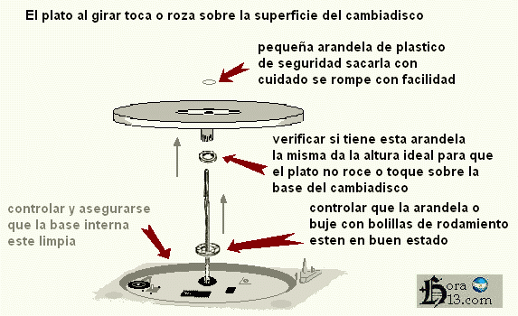 En este caso que se repite con frecuencia diremos algo que comentan a menudo nuestros técnicos , un cincuenta cincuenta ...y la razón es porque esta falla la mitad se debe al desgaste lógico del aparato , pero la otra mitad se debe a manos inexpertas , en la mayoría de los casos se repite el caso que mencionamos arriba (cuando pierden la pequeña bolilla de acero) Luego aqui es similar , al retirar el plato siempre pierden una arandela que es vital para mantener el plato libre de rozamiento con la base y esto se debe a que si no se tiene cuidado cuando se retira el plato esta suele venir pegada donde se encuentran los dientes de tracción y luego cae al piso , jamás la vuelven a poner y esta es una de las causas mas frecuentes del rozamiento , además de trabar todo el mecanismo del automático o producir ruidos molestos al funcionar . La limpieza interna aqui es muy importante porque con el correr de los años se van depositando en su interior todo tipo de cosas pequeñas , tornillos , alfileres etc , verificar siempre esto . También vimos casos no muy frecuentes pero los vimos , donde el eje central estaba torcido , nunca por causas naturales solo que alguien intento vaya a saber que y termino inclinándolo a un costado y esto si que es un problema grave , muchas veces sin solución recuerden que es cilíndrico y hueco en su interior y nunca volverá a su estado original , luego hay que cambiarlo por otro sin lugar a dudas .
