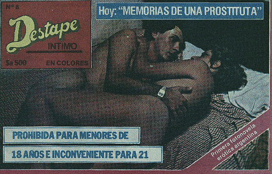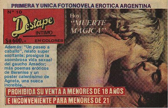 Las primeras revistas eroticasY como tratamos de ilustrar un poco la historia , podríamos también afirmar que si bien hoy no es muy recordada aparecía para los 70 y comienzo de los 80 ." Destape intimo " es de destacar fue la primera fotonovela Argentina en colores , se vendía en los kioscos en las clásicas bolsitas negras , fue un comienzo casi rudimentario del gran destape que vendría después y realizada por actores argentinos , no tuvo gran trascendencia y el consumo se centraba solo en el lector masculino , como era de suponer claro... Al mismo tiempo años 60 salían revistas en blanco y negro de una calidad pésima en fotografía y dibujos aun así se vendían igual caso concreto la revista Sexy Boom donde aparecía la vedette Fulma Faiad Aquellas revistas pornográficasSucedió lo mismo con " Pornográfica” , Sex o Top estas dos ultimas en su versión Historietas , fueron las primeras revistas pornográficas en la Argentina y a pesar de su contenido muy precario y básico en fotografías o dibujos fue un éxito en ventas , luego en 1990. la mayoría de ellas se dejaron de imprimir .(leer derechos de autor)
