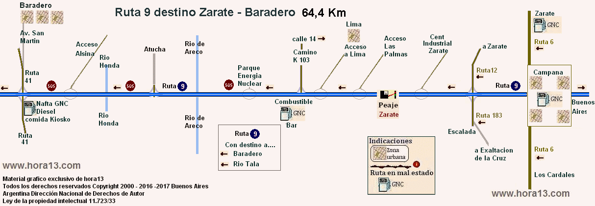 por Ruta 9 Zarate hasta Baradero con sus expendios de combustible nafta diesel GNC y peajes Además los cruces hasta Las Palmas Lima , Atucha y Alsina |