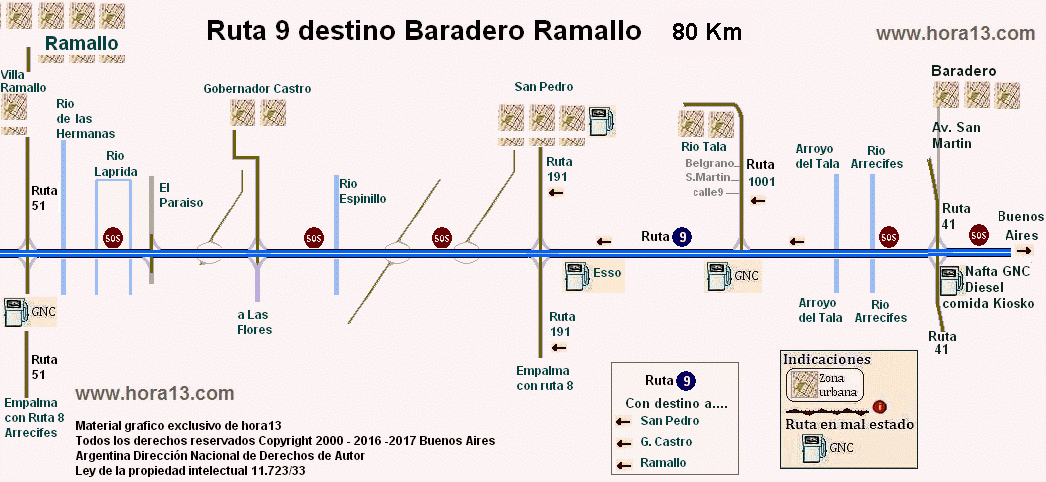 Por ruta 9 desde Baradero a San Pedro Pasando por Rio Tala , Gobernador Castro y Ramallo , empalmes rutas 1001 , 191 y ruta 51 con sus expendios de combustible y SOS . |