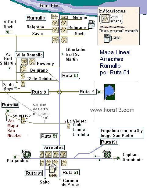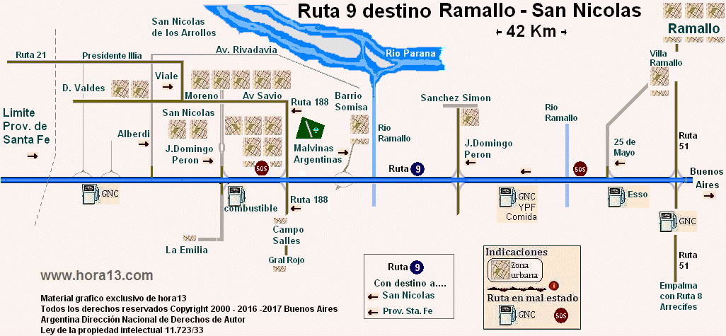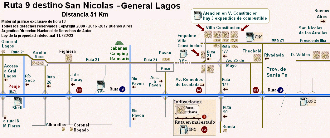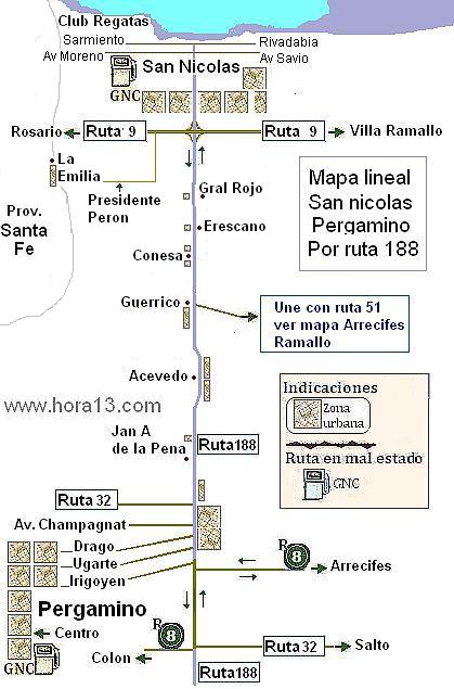 por ruta 9 de San Nicolás pasando por Villa Constitución y General Lagos , con su trazado en paralelo con la ruta 21 . Además los cruces de rutas 177 , ruta 90 , ruta 26 , ruta 18 ..etc. |