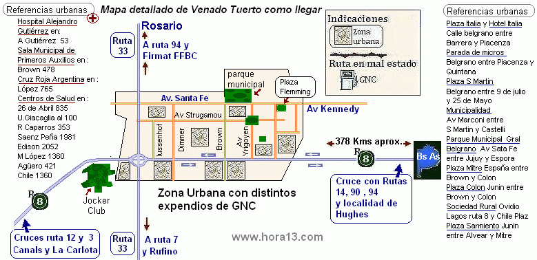 Como llegar , ruta 8 , ruta 33 Zona urbana , Avenidas , plazas Con sus expendios de GNC. |