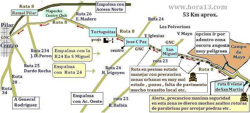 Avenidas y rutas que se cruzan como ruta 23 ruta 24 , 25, 28 y 234 . Detalle peajes . Expendios de GNC precauciones , alertas y estado del camino . |