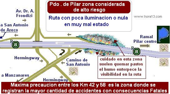 Recomendaciones En el Km. 42, en inmediaciones de la ex avícola San Sebastián , esto pertenece al Partido de Pilar, la ruta registra serias fallas en su trazado y falta total de iluminación, por lo que uno de sus tramos llegó a ser bautizado como “la curva de la muerte” hubo muchos accidente fatales así que precaución .. También desde La Carlota a Río Cuarto, llena de baches y remiendos presentan muchísimos desniveles en el asfalto no imprima demasiada velocidad . Otro tramo en pésimo estado es en el kilómetro 105 en la zona de San Antonio de Areco. También debemos informar que el partido de Pilar últimamente no solo la 8 esta mal iluminada , si no que suelen quemar pastos muy seguido al costado de la ruta lo que la convierte en muy peligrosa , si a esto le sumamos los días de mucha niebla alertamos máxima precaución , ya sucedieron accidentes gravísimos en el kilómetro 59 donde hubo una victima fatal y mas de 15 heridos por choques en cadena ( mapa abajo ) |