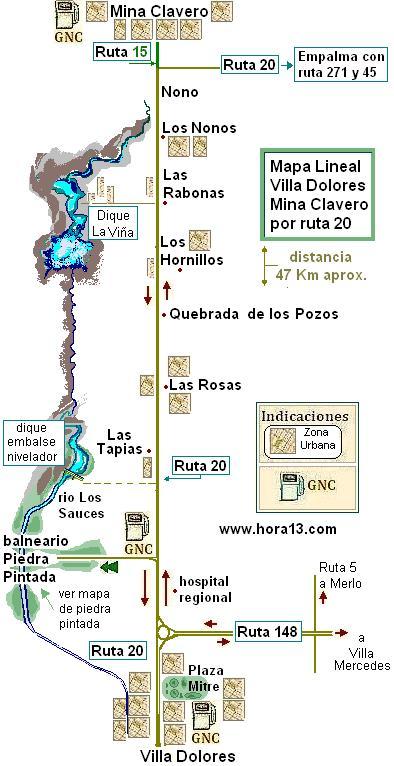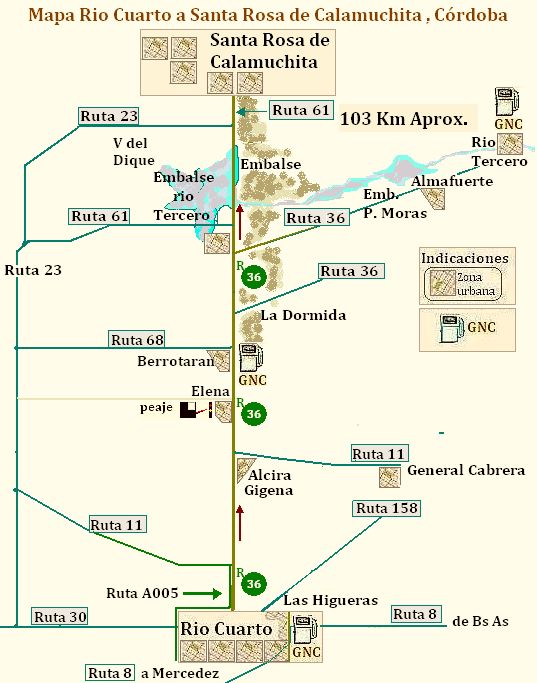 Se detallan los Peajes y los tramos en mal estado , camping , avenidas y rutas que la cortan como ruta 6 , ruta 39 ruta192 , ruta 193 , ruta 41 , ruta 31 ruta 51 , ruta 191 etc . y las estaciones de expendio de GNC |