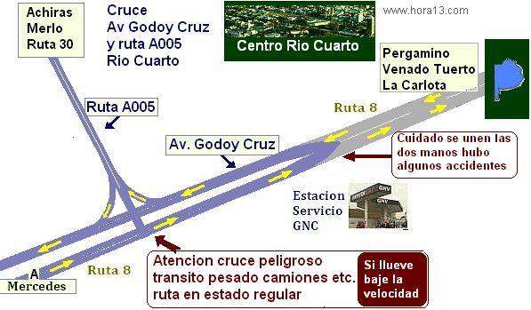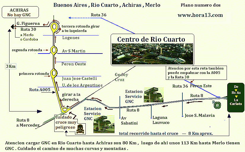 Avenidas y rutas que se cruzan como ruta 36 y ruta 30 . Se detallan cruces peligrosos , Detalles de expendio de GNC , cruces y rotondas peligrosas . |