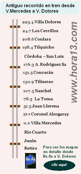 Estación de trenes Villa Dolores , Córdoba Fue inaugurada en el año 1900 a cargo del ferrocarril Buenos Aires al pacifico . Fue sin lugar a dudas una de las estaciones mas importantes en cuanto al turismo en los años 50 a los 80 ya que era el final del recorrido del tren Sierras Grandes y El libertador que pertenecían al Ferrocarril San Martín . La cabecera era Retiro en Buenos Aires y luego de recorrer unos 914 kilómetros llegaba a su fin en la tan recordada estación V . Dolores perteneciente al departamento de San Javier Córdoba , gran parte del turismo se llegaba hasta Piedra Pintada un hermoso pueblo pintoresco que se encuentra a nos 5 kilómetros mas adentro , con su mítico río Los Sauces y por la misma ruta 20 une pueblos turísticos como Las Rosas , dique nivelador o boca de agua etc . Los trenes salían en época de verano de su Cabecera en Retiro con una frecuencia de tres veces por semana los lunes , miércoles y viernes cerca de las 16 horas . Era uno de los mejores trenes en cuanto a confort , el Sierras Grandes contaba con coches comedor , pullman y el Libertador traía en su formación hasta coches dormitorios .
