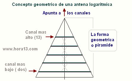 Para ir cerrando este tema : Seguro que tu nos vienes siguiendo desde el primer capitulo , entonces no es novedad para ti que resulta inaceptable dar por valido a una antena de cuatro elementos , donde tres están cortados " iguales " y como todos sabemos tenemos por lo menos 5 canales a captar ( Caso Buenos Aires) y por supuesto la antena debe recibir distintas frecuencias , de echo la definición de una antena logarítmica o multicanal seria mas o menos así : Corresponde a una antena con varios elementos ( dipolos) donde sus frecuencias y resonancias se hallan en progresión Geométrica donde el dipolo mas grande corresponde al canal mas bajo ( canal 2) y el mas pequeño al canal mas alto ( canal13) (Ver figura abajo) |