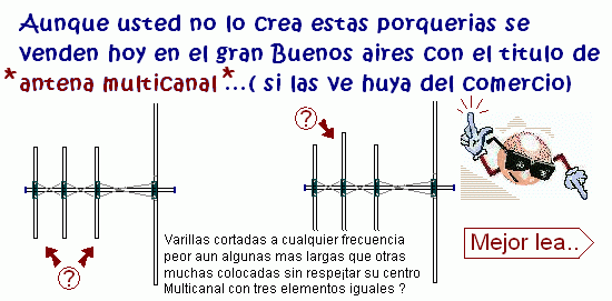 Es imposible entender que una antena de cuatro elementos cortados " a la bartola" , donde la varilla de canal bajo solo por dar un ejemplo estaba sintonizada entre canal 5 y 6 y las varillas restantes todas iguales aproximadas a canal 10 se puedan vender con el titulo de antena multicanal no ? Mire se venden y las compran , de echo vimos muchísimas en L del Mirador , Madero , Liniers , etc Esto es en Gran Buenos Aires Luego el pobre usurario que las compro hoy todavía preguntándose porque todo los canales se ven con llovizna y algo peor aun , sospechando que a lo mejor la armo mal o no supo conectarla ... En realidad nada hizo mal , la antena por si sola es un verdadero desastre , ni que hablar del material que trae ... Y de paso también este tutorial nos sirve para afianzar un poco mas nuestros conocimientos y entender que no todo lo que se vende viene con garantía de buena calidad |