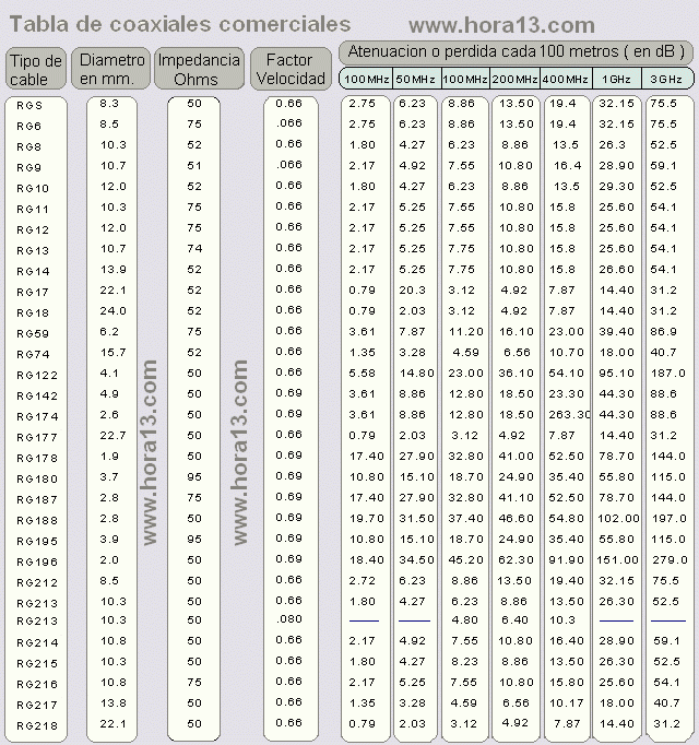 Tabla de los cables coaxiales comerciales , características , perdidas por metro o atenuación , ganancia , impedancias factor velocidad y tipo de cable . ( ideal para el taller o imprimir )