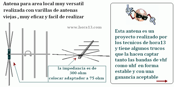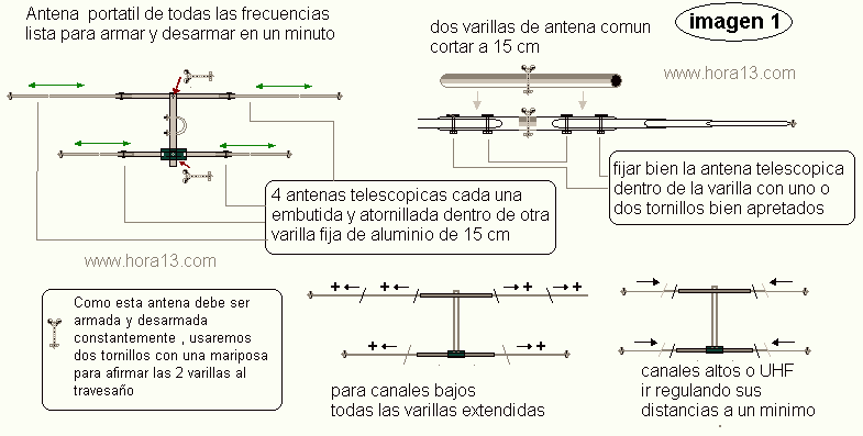 A diferencia de la antena ( imagen uno) esta es (fija) y no podemos regularla para sintonizar varias frecuencias o varios canales pero las ventajas de esta segunda opcion son importantes . 1- es mas robusta 2 - obtenemos mayor estabilidad y ganancia por lo menos en UHF y canales medios ( 10 , 11 , 12 y 13 ) Su impedancia es estable , por supuesto con su adaptador a 75 ohm quizás el único inconveniente es que encuentres las varillas de aluminio finas para efectuar la interconexión de los dos dipolos , no hace falta decirte que abundan en antenas viejas . 3- Probamos esta antena portátil casi con el mástil ( en la mano) en muchas provincias y obtuvimos buenos resultados de captación . |