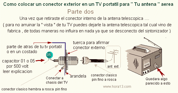 Una vez retirada la antena o desconectada de su sintonizador , buscamos con cuidado efectuar un orificio en la parte de atrás del aparato y colocar un conector hembra a rosca tipo pin fino . La mejor idea de como hacerlo lo tienes en la segunda imagen a tu izquierda . Luego veras soldado en la entrada interna del conector un capacitor . El capacitor lo único que hace es aislar el aparato de posibles accidentes como entradas de tensión o fuertes estáticas Nos paso en las cumbres de las sierras de Córdoba , cuando en las alturas estábamos probando captar algunas señales y nos vimos envueltos en una nube , luego se nos quemo el sintonizador por la gran cantidad de tensiones estáticas que en ese momento había . Y quemar algo de tu equipo fuera de casa estas en graves problemas , sabes a que me refiero no ?