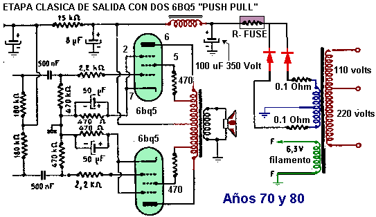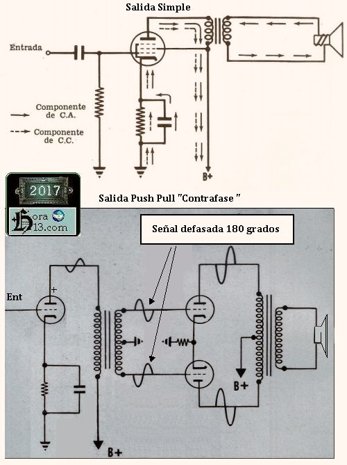 El problema se nos presenta a menudo cuando trabajamos con equipos de audio donde en la salida vemos un par de válvulas conectadas en contrafase (push-pull) ( tira y afloje) donde generalmente vienen apareadas o sea nacen de la misma serie . Claro estamos hablando de un equipo que fue armado hace un montón de años y ahora esas válvulas ya no esta tirando ( parejas) por el desgaste lógico de cada una y ese agotamiento no siempre es parejo para ambas . Traducido al idioma cotidiano " las válvulas dejan de ser hermanas " Y esto se debe en gran parte porque las válvulas funcionan con temperaturas superiores a los 100 ºC y según el circuito o modelo muchas de ellas llegan hasta los 250ºC . ( documento exclusivo de hora13.com) Abajo otro esquema simple que nos muestra una amplificador clase A y uno con salida Push Pull