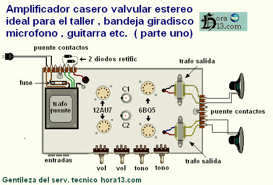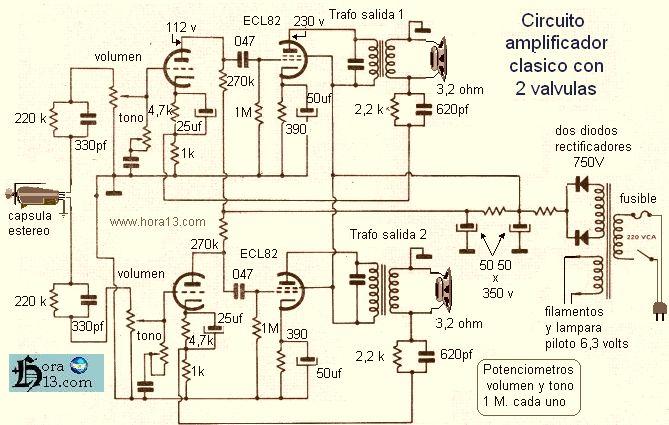 Con este circuito realizado por los técnicos de hora13.com tenemos un viejo refrán .. Pasaran los años y hasta desaparecerán los técnicos pero el amplificador seguirá funcionando Y esto se debe a su simpleza del armado y controlar que el amplificador no sea exigido en las tensiones de trabajo , por lo tanto se busco menos tensión en las placas , porque muchas veces suele quedar encendido mas si es en un taller de reparaciones .