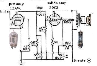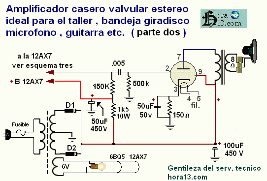 Las precauciones para aquellos que recién comienzan y no tienen mucha experiencia son casi las mismas que detallamos en el caso que vimos arriba ( Ranser) Salvo que en este caso cambian las válvulas usando las clásicas 6BQ5 como etapa de salida y las 12au7 o 12ax7 como pre amplificadoras |