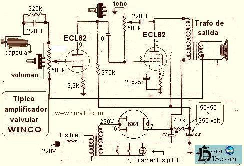 Otro modelo de circuito con la ECL82 que se uso hasta los años 70 y como verán es monoaural , Casi similar en el diagrama a la imagen ( arriba) Seria la base en el armado de los circuitos en estereo que se aplicarían en los famosos tocadiscos llamados " combinados" . esta válvula la ECL82 y su competidora la 6BQ5 serian las mas usadas en amplificadores medianos , pero muy pronto serian desplazadas por un pequeño competidor llamado transistor cumpliendo las mismas funciones y trabajando con apenas unos 12 o 24 volts . Aun así por varios años inclusive hasta los 80 se siguieron armando amplificadores de audio inclusive para guitarras , micrófonos etc. |
