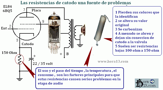 El paso del tiempo es un factor muy importante a tener en cuenta cuando reparamos aparatos antiguos Uno de los problemas o fallas mas comunes cuando No tenemos audio es la resistencia a chasis que se encuentra en el cátodo de la válvula de salida ( Pata numero tres) En este caso usamos como ejemplo la clásica 6BQ5 . Muchas veces si tratamos con amplificadores estereo puede que un canal funcione bien y otro muy bajo o directamente sin sonido y este ejemplo puede ser una de las causas de esta falla muy común en aparatos viejos |