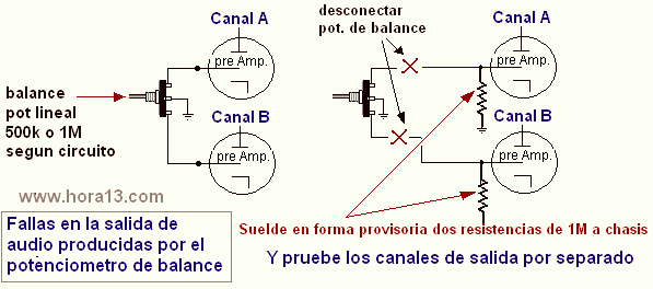 Esta falla es muy común , pero para quienes recién comienzan , les causa un dolor de cabeza encontrarla , generalmente en equipos antiguos valvulares como el " Ranser" es común que tengamos problemas en una de las salidas de audio , como es de suponer lo primero que hacen es cambiar la válvula de salida y pre en caso que la tenga , pero el dilema comienza cuando a pesar de cambiarlas el problema sigue ... Lo que ocurre con estos circuitos es que si se corta o entra en falso contacto el potenciómetro lineal de balance , quedan las grillas " libres" o sin polarización de las válvulas y el resultado será audio muy bajo o distorsionado , no entraremos en detalles técnicos porque este sitio esta dedicado a novatos o amateurs , pero solo para que tengan una idea diremos que el balance se efectúa por atenuación hacia un lado u otro , dado que la maza se sitúa en el centro del potenciómetro y al mismo tiempo polariza la grilla de entrada de cada válvula . Una forma rápida de sacarse la duda la tienen en la figura bajo. |