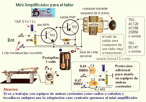 El Mini Amplificador indispensable tenerlo en el taller Cuantas veces nos paso que debemos sacar para reparar o controlar un cambiadiscos de un equipo muy grande y llevarlo a la mesa del taller ? Luego para probarlo debemos colocarlo otra vez a su lugar original y esto nos resulta molesto y complejo ya que lo equipos antiguos generalmente son demasiado aparatosos y porque no decir gigantes . Con este mini amp. tranquilamente montado y armado en una pequeña caja de unos pocos centímetros tendremos un volumen suficiente como para probar el estado de la pastilla y púa y también detectar si las velocidades del plato son correctas . También les resultara muy útil , para probar etapas de salida de audio de radios y otros equipos , pero Cuidado si trabajas con aparatos de ambas corrientes usa la modificación que muestra la figura . |