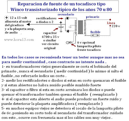 En realidad cuando llegan a nuestras manos estos aparatos antiguos a nuestras manos en el caso de estos tocadiscos tipo winco ya transistorizados para los años 70 u 80 , no hay mucho que investigar si no funcionan . Siempre tener un tester a mano y un mínimo de conocimiento caso contrario "olvídese" . En este caso veremos " la fuente de alimentación" imagen a su izquierda . Lo primero medir el fusible , si esta quemado suplantarlo por otro ( nunca reforzarlo o colocar alambres de cobre entre sus bornes ) Si vuelve a saltar , verificar el primario ( bobina 220 v ) en muchos casos están las espiras en corto deterioro típico de los años , en ese caso cambiarlo , pero con mucho cuidado deberá investigar que salida tiene ( ejemplo 12 v 13 v 18 v etc. ). Otra falla común son los diodos rectificadores muchas veces son dos y en otros modelos cuatro solo conque uno de ellos este en corto o abierto , no solo no tendrá sonido alguno , hasta puede ser que esta falla le que queme el fusible de entrada . Por ultimo el capacitor tipo 4700 o 5000 x 35 o 50 v según el modelo , si esta abierto o en corto ; Si deseas saber como nacio el winco y parte de su historia ( aqui) |