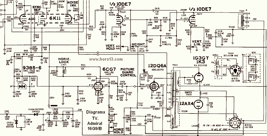 Circuito diagrama TV F.M o Evita Fabricaciones militares Circuito diagrama TV Admiral modelo 16G9/B , etapa horizontal y vertical Con Valvulas 10DE7 , 1K3 , 1G3 , 12DQ6 , 12AX4 , 6CG7 , 6K11 Circuito salida horizontal y vertical , con valvulas 6DQ6 , 6DE4 , 6AX4 1B3 , 1K3 ,1G3 y 6U8 , circuito empleado por la Philco, Well Gardner , Dumont Circuito Etapa salida y osciladora horizontal valvular , años 60 y 70 circuitos y marcas como Well Gardner , Inerlo , Dumont entre otros Circuito típico de salida vertical valvular , con EL86 , 12AU7 y 6AU6 las etapas osciladora , detectora de sincronismo y AGC . Circuito de salida horizontal y etapa osciladora TV. valvular marca Fapesa valvulas PL36 , 12AU7 , PY88 , DY87 . |