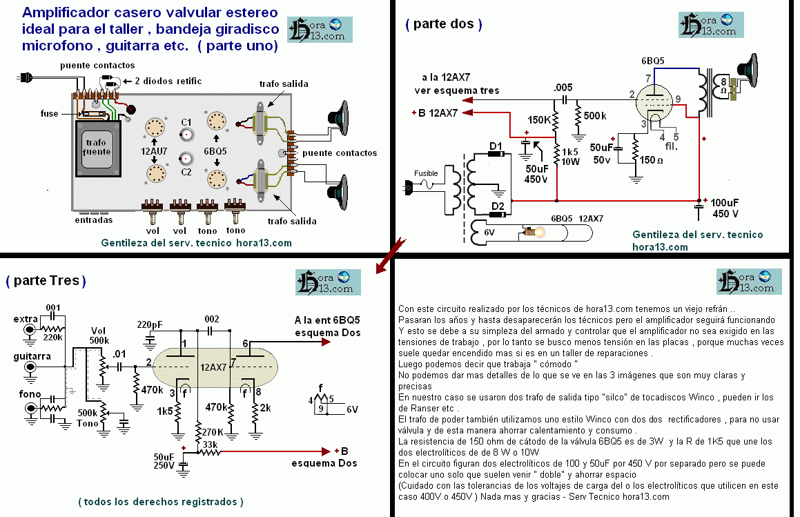 Un amplificador valvular casero fabricado por los técnicos de hora13.com Para guitarra eléctrica , micrófono, bandeja giradiscos y entrada extra Ideal para el taller o aficionados En estereo o monoaural " el todo terreno" |