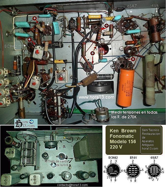 " para el taller " Tocadisco ( combinado) Ken Brown Fonomatic modelo 156 Datos técnicos. Mayormente este equipo no presenta grandes problemas en su mantenimiento , mas allá de alguna válvula agotada o quemada su circuito esta bien elaborado como para soportar varios años de uso SI su falla mas frecuente son las Rde ( 270 k ) hay que medirlas todas como lo indica la imagen ... (ampliar) .....