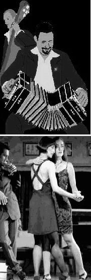 mirá que viejo estoy..... El tano atesora esas melodías de autores anónimos y la encierra en una cajita “mágica” llamada organito... Ahora ya los compadritos (con la compañía del “tano del organito) ya tienen su música...Por ahora en la vieja acordeona napolitana, pero pronto descubrirían a un instrumento que cambiaría para siempre la historia de la más popular música criolla ..Desde un barco alemán, los compadritos afincados en el puerto de la Boca, escuchan asombrados a unos marineros que ejecutan una música celestial e incomparable que sale de unas “cajas cuadradas” con teclas y botones a ambos lados y que se abre y se cierra como un fuelle (nombre con el que se lo conocerá de aquí en más).- Pero para su mayor asombro, al acercarse al buque observaron que al lado de estos marinos, había otros que los acompañaban con tres violines y que todos juntos (además de una pianola) sonaban como uno solo... Ese día nace en ellos la idea de “la orquesta” para acompañar al baile y se empiezan a formar los cuartetos ( un piano, un violín, un fuelle y una acordeona).- Cuando el compadrito se da cuenta de que “pan con pan, comida de sonso” y se percata de que “a escondidas” las paicas (niñas bien) y las grelas (niñas mal), también lo bailan, se comienzan a formar las “parejas mixtas” que se prendían en una danza sensual, sexual y apretada, agresiva y desafiante, lo que hace que el entonces Papa Pio X la declare “prohibida” por tratarse de un “baile demoníaco” y amenaza con excomulgar a quien lo practique.-Pero..¿ que les iba a importar a aquellos socialistas y anarquistas ateos lo que “joraca” dijera el Papa..? Y el tango (y su hermana mayor, la milonga) siguieron adelante y comenzaron a aparecer los “poetas trasnochados”, trágicos personajes que, en su gran mayoría descargaban sus frustraciones componiendo letra de tango.-Eran un grupo de “ cornudos consientes”, traicionados por las grelas, hazmerreír de las “barras” de compadritos, solitarios habitantes crónicos de las desvencijadas mesas de madera de algún boliche de mala muerte.- Allí era “muy bien aprovechados” por los autores de música (otra casta intelectual superior) quienes les compraban los “derechos de autor” por un simple vaso de tintillo y unas pocas chirolas (monedas).- Así personajes que hoy están insertos en el “libro de oro” del género como Firpo, Canaro, De Caro y otros, se beneficiaron con la producción literaria de estos “genios patéticos” y marginados.. Cada letra de tango se convirtió en una denuncia sobre la “infidelidad de la mujer”..El varón lloraba esa traición, juraba venganza,( a veces la ejecutaba) “aquí traigo en la maleta las trenzas de mi china y el corazón de él “.... Las mujeres porteñas protestaban en voz baja( por miedo a las represalias) “ No todas somos prostitutas, ni todas somos infieles,¿ acaso los hombres no tienen madre y hermanas ?”... Vacarezza y Laferrere entre otros se hacen eco de éstos reclamos y así nace el “sainete porteño” teatro tanguero con cuna de conventillo, festivo y risueño que “pinta” caricaturescamente a los “ personajes de la época” .- Al garebo pintón (galán), al guapo del barrio (su rival eterno), a la gallega dueña del conventillo, al Tano verdulero, al turco comerciante de todo, al judío ladino y astuto, al “carniza” (generalmente un criollo hábil con el cuchillo) a la “francesita” (prostituta o copera) siempre generadora de “conflictos entre los varones” que solían terminar con algún que otro d4egollado y despanzurrado..- Sobre suaves compases de habanera, los actores van desgranando en versos sus diálogos..Se canta el tango , la milonga, el valcesito criollo y todo se dice en verso..... Así llega el tango al escenario de los teatros argentinos, mientras allá en la lejana Francia, Roberto Firpo y Francisco Canaro comienzan a escribir otra historia.- La denominaremos, “ el Tango llega a París”..... Le